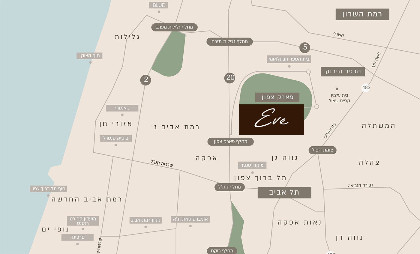 EVE NORTH PARK גובלת בשכונות הצפוניות תל אביב: תל ברוך צפון, רמת אביב ג׳, צהלה ונאות אפקה. לפארק צפון גישה קלה, מהירה ונוחה לנתיבי אילון, כביש 2 (החוף), כביש 5, דרך בני אפרים, שדרות רוקח ושדרות קק”ל והירידה החדשה והמהירה לכביש 20 הישר מהשכונה. בכל דרך שתבחרו, תמיד תהיו קרובים.